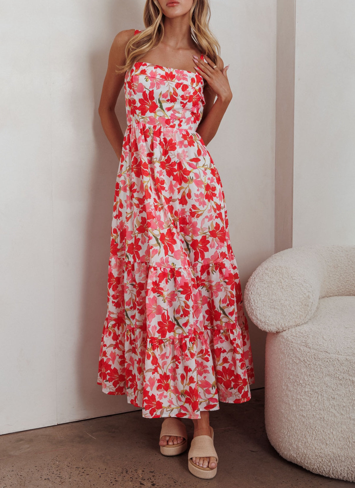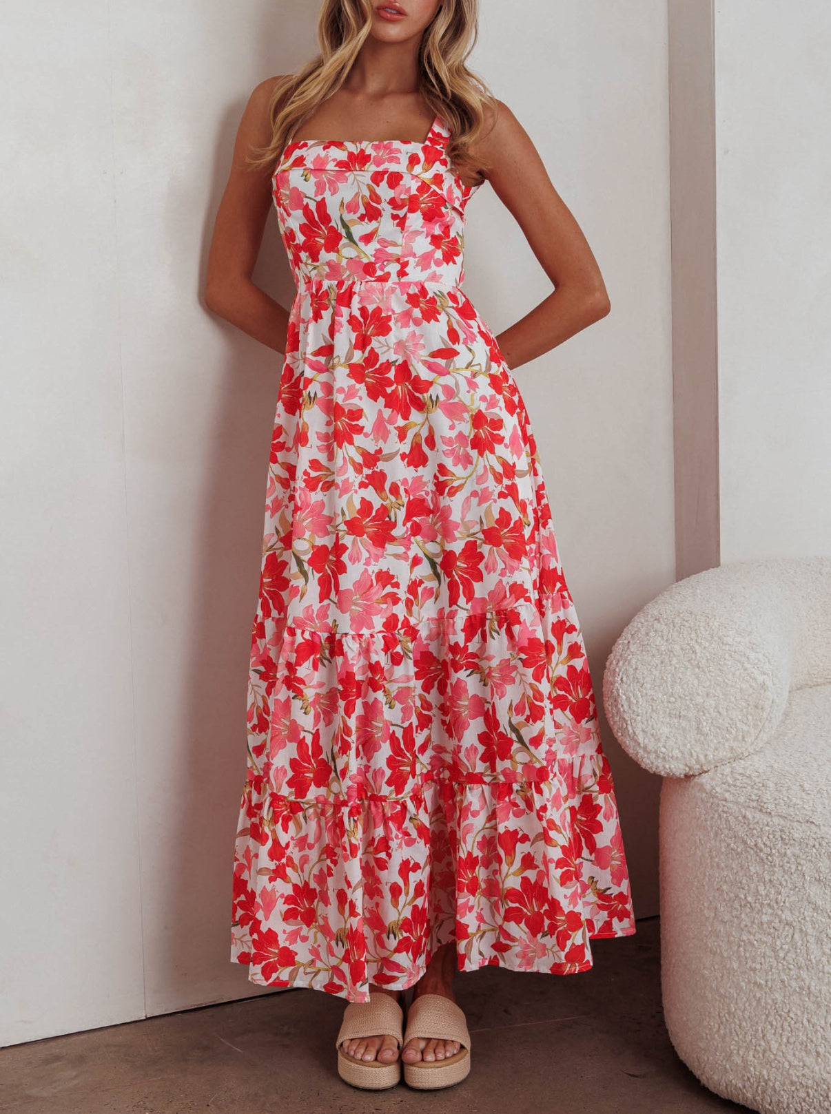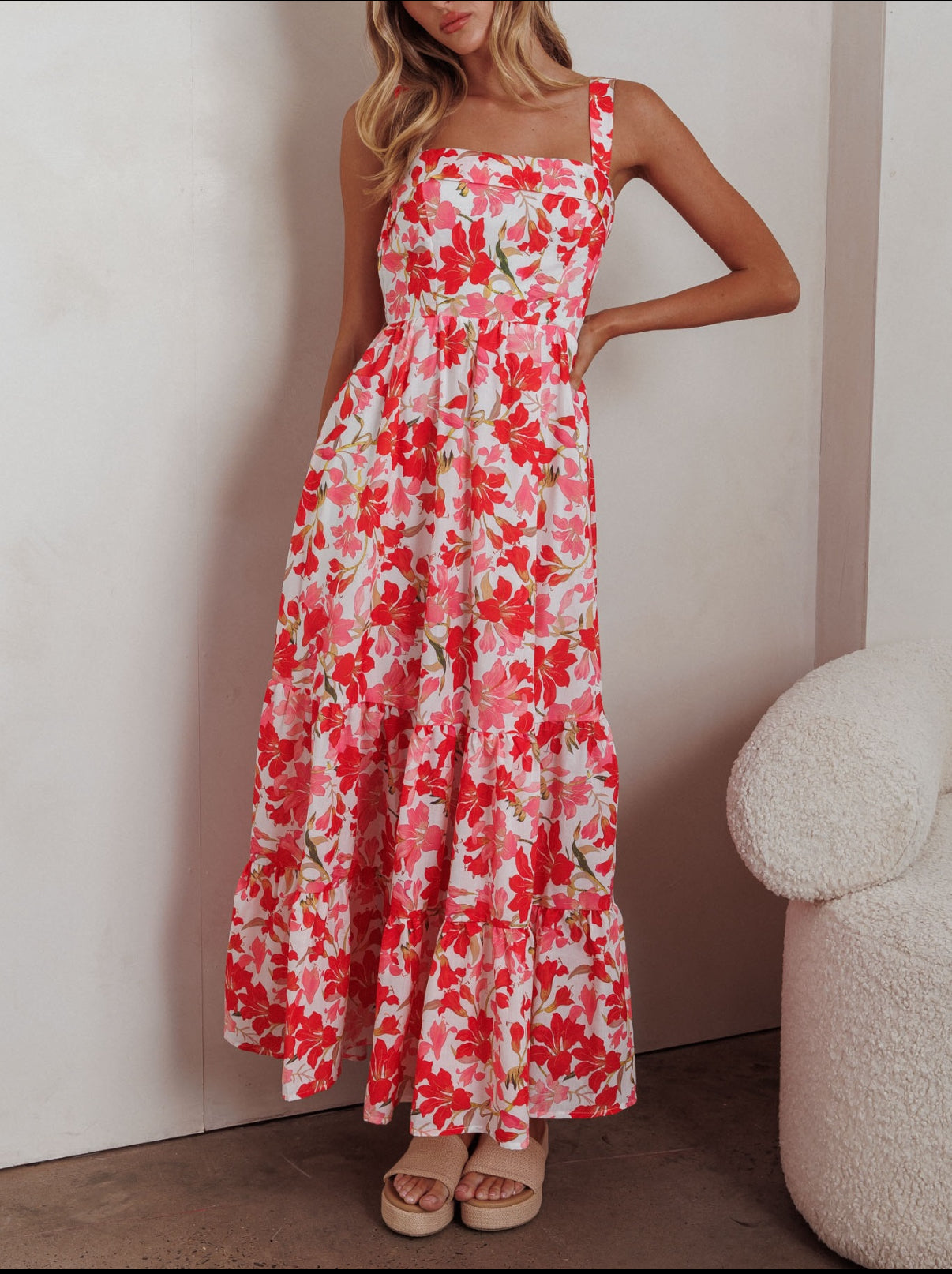 Twirl into tropical bliss 💫 With its vibrant floral print and playful open-back design, this maxi dress is your go-to for summer soirées and weekend getaways 🌺✨