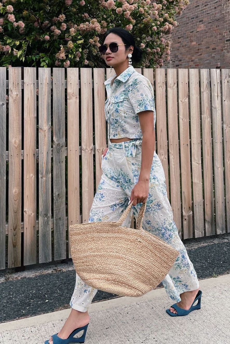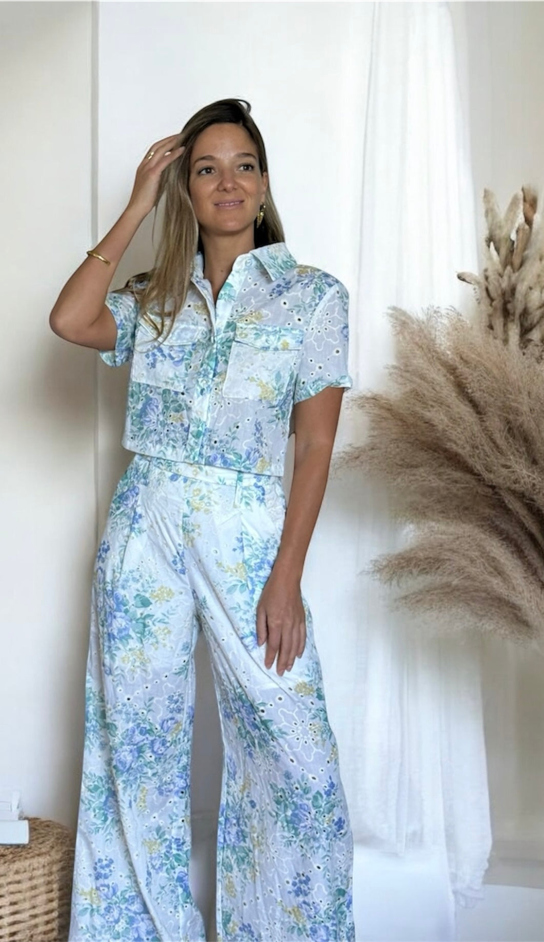 This elegant two-piece set is crafted from delicate broderie anglaise cotton featuring a soft floral print in shades of blue, green, and yellow over a white base. The short-sleeve cropped shirt includes front patch pockets and a front tie or button detail, giving it a feminine yet structured silhouette. The matching high-waisted pants have a relaxed, wide-leg cut that elongates the figure while maintaining effortless comfort.