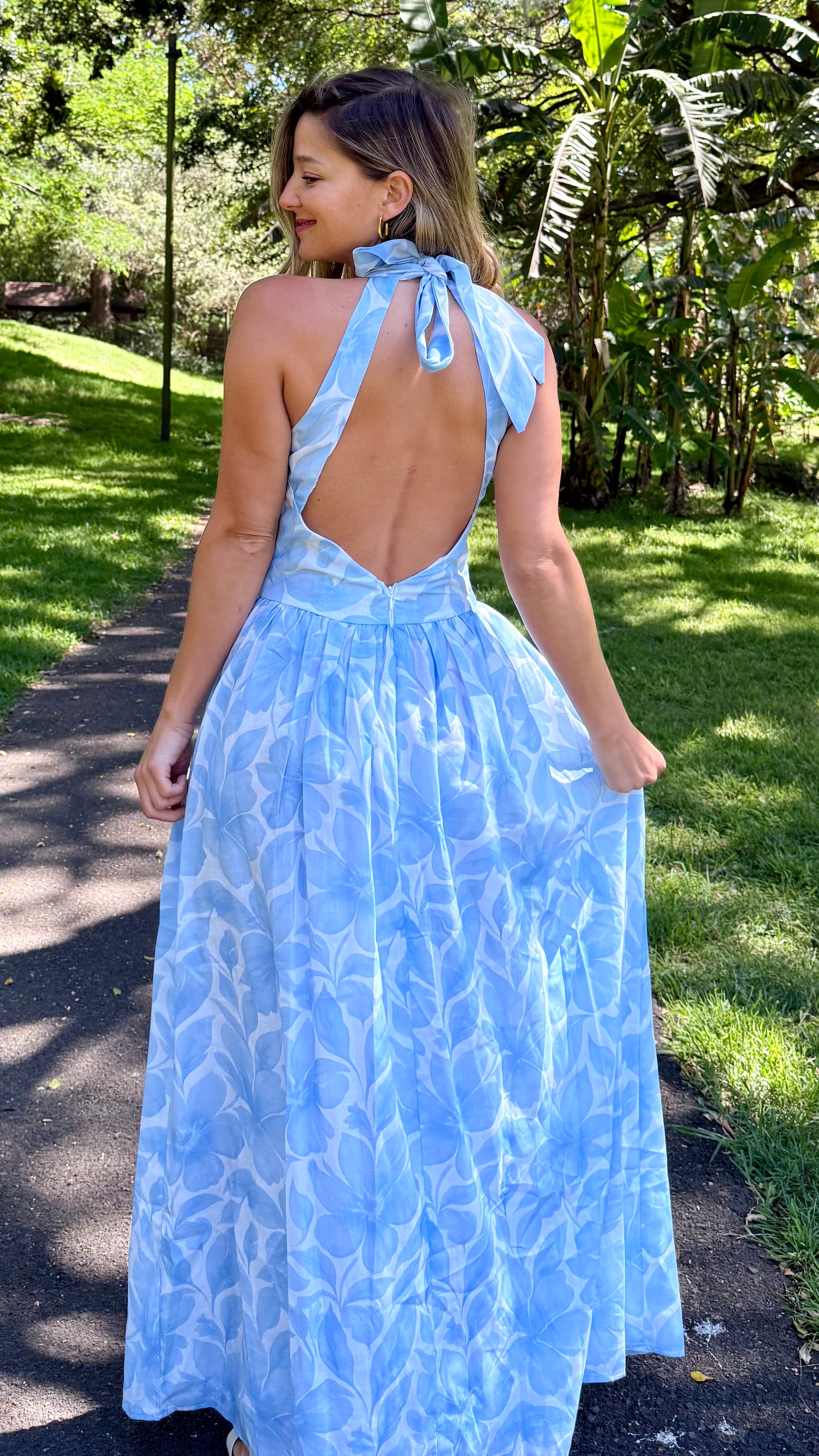 The halter neckline creates an elegant, elongated silhouette, while the gathered waist adds gentle volume through the skirt for beautiful movement. The airy blue floral print gives it a fresh, ethereal look ideal for daytime events, beach outings, brunch dates, or garden celebrations.
