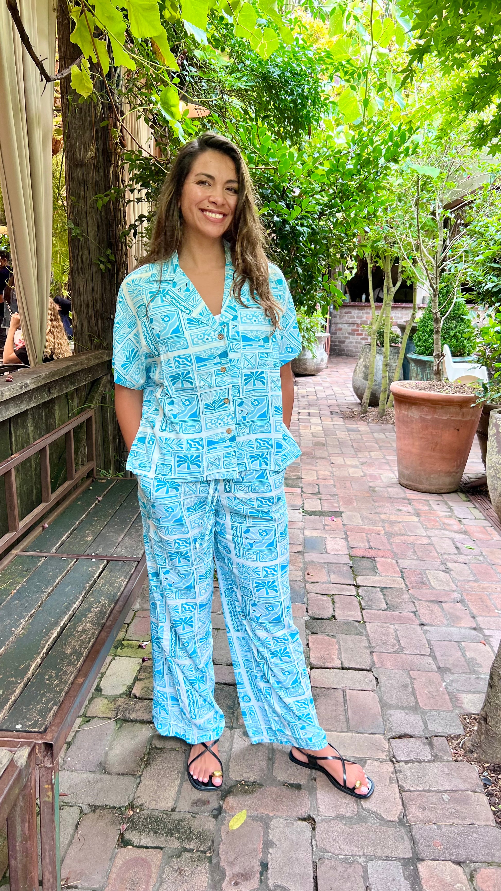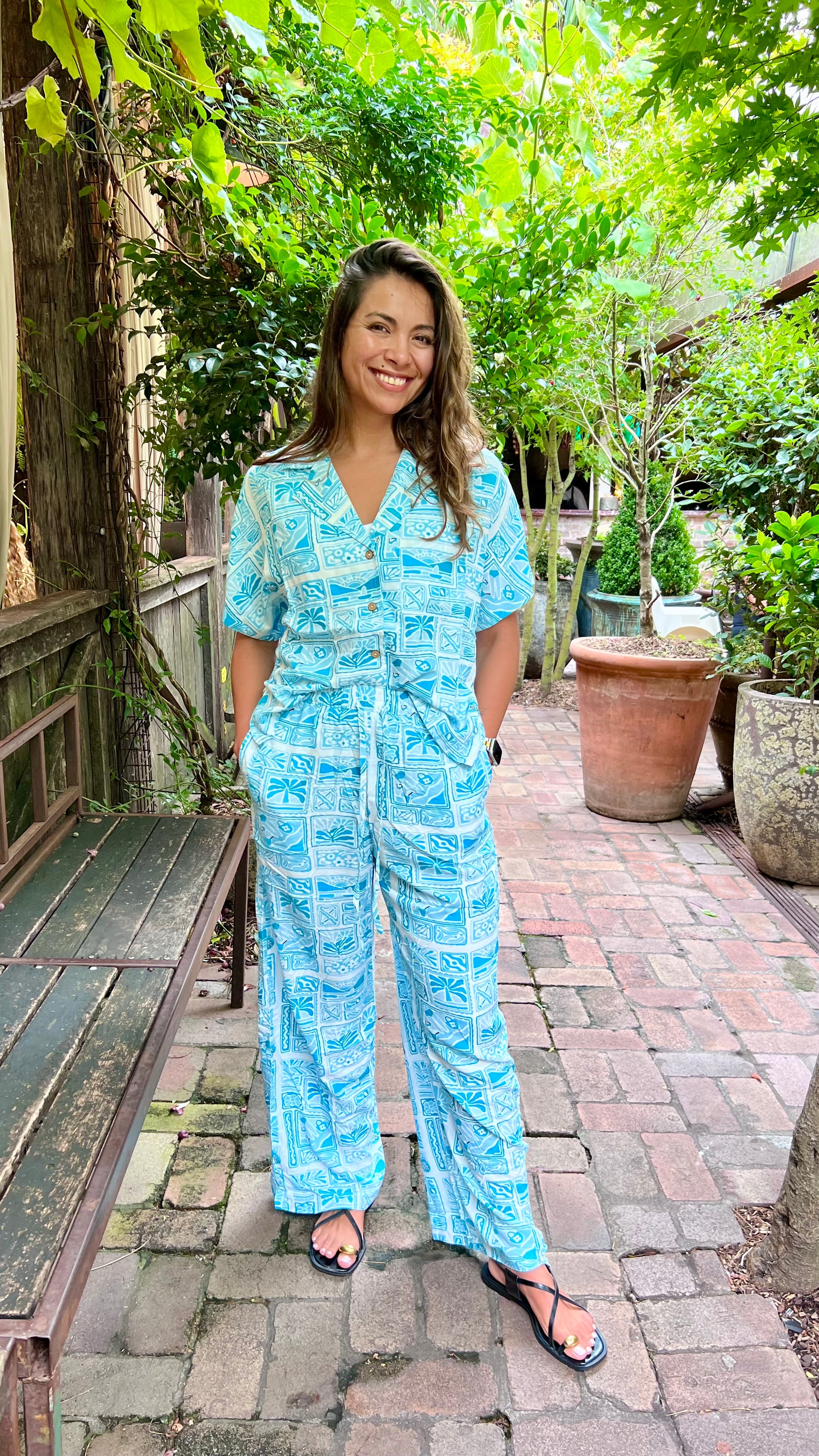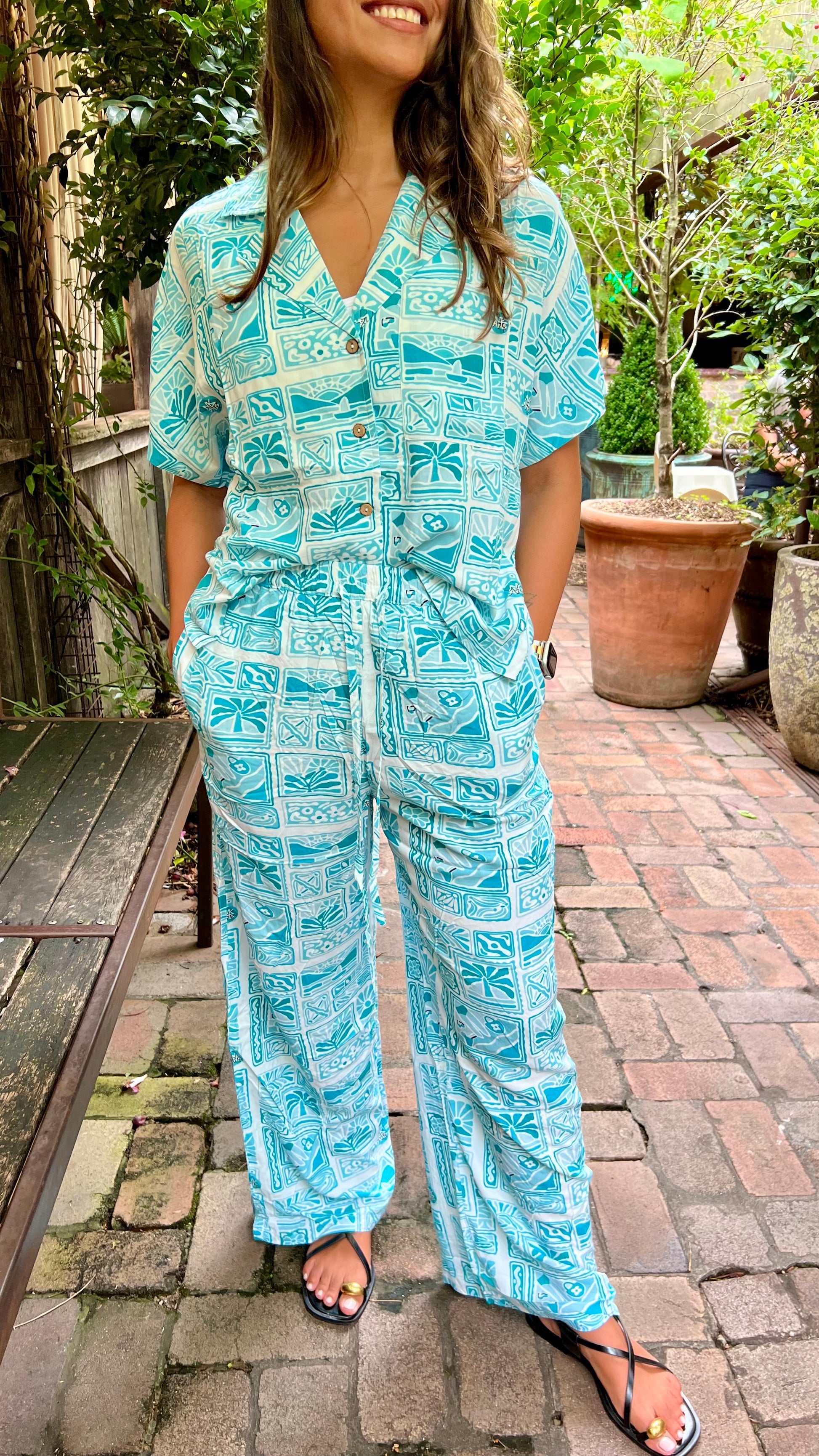 The Tillie shirt is a relaxed, short-sleeve button-up with a vibrant blue and white tropical print. It features a V-neckline, wooden-style buttons, and a slightly loose fit for effortless comfort. Made from lightweight fabric, it’s perfect for warm days and tropical getaways. Pair it with the matching pants for a coordinated, laid-back look.