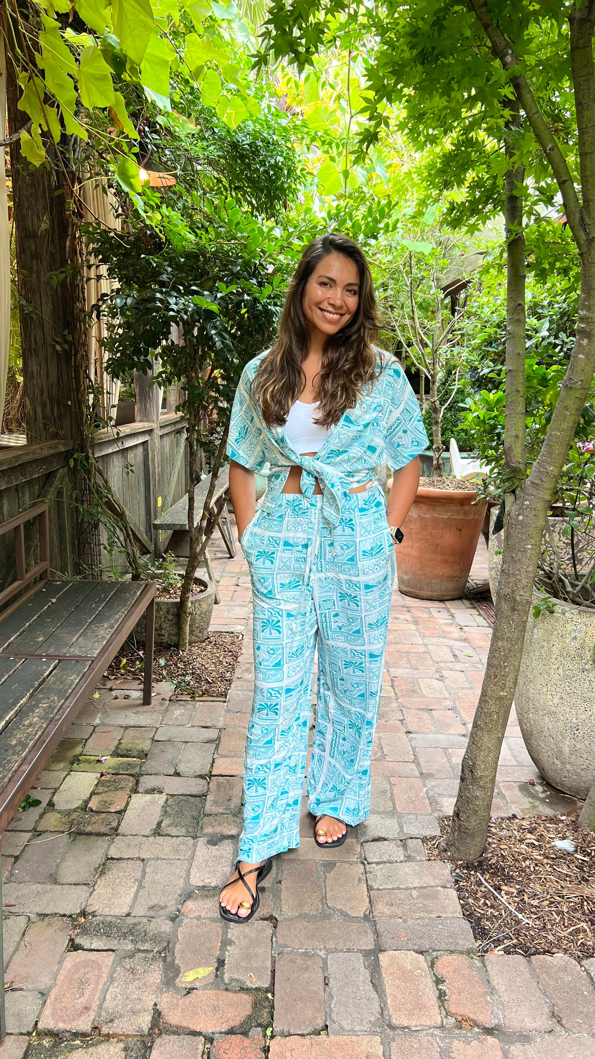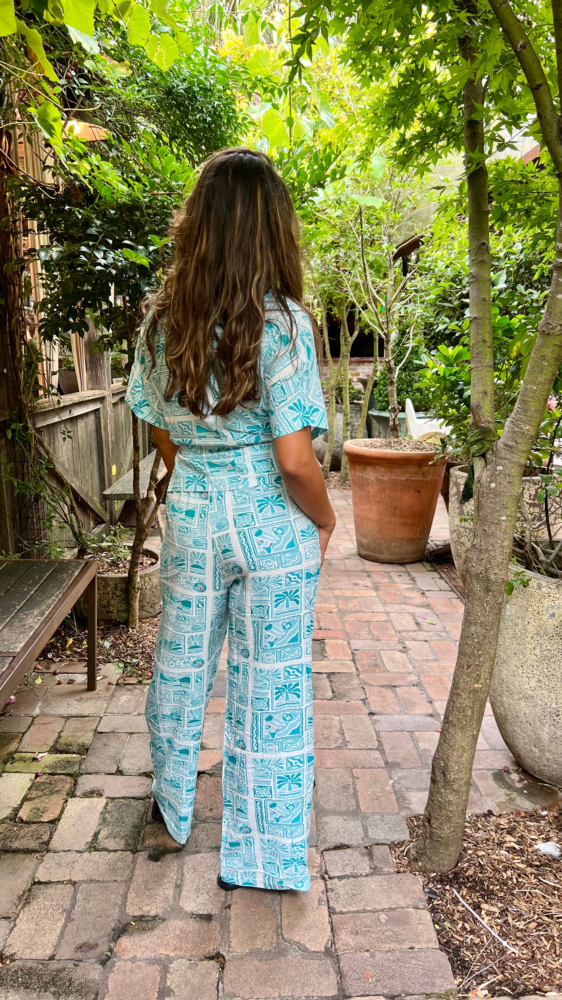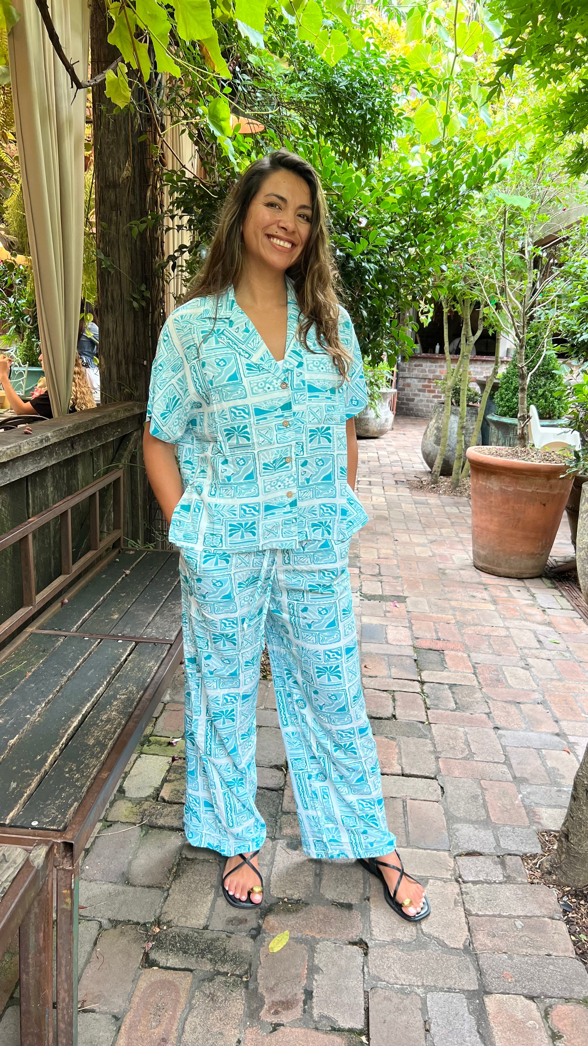 The Tillie shirt is a relaxed, short-sleeve button-up with a vibrant blue and white tropical print. It features a V-neckline, wooden-style buttons, and a slightly loose fit for effortless comfort. Made from lightweight fabric, it’s perfect for warm days and tropical getaways. Pair it with the matching pants for a coordinated, laid-back look.