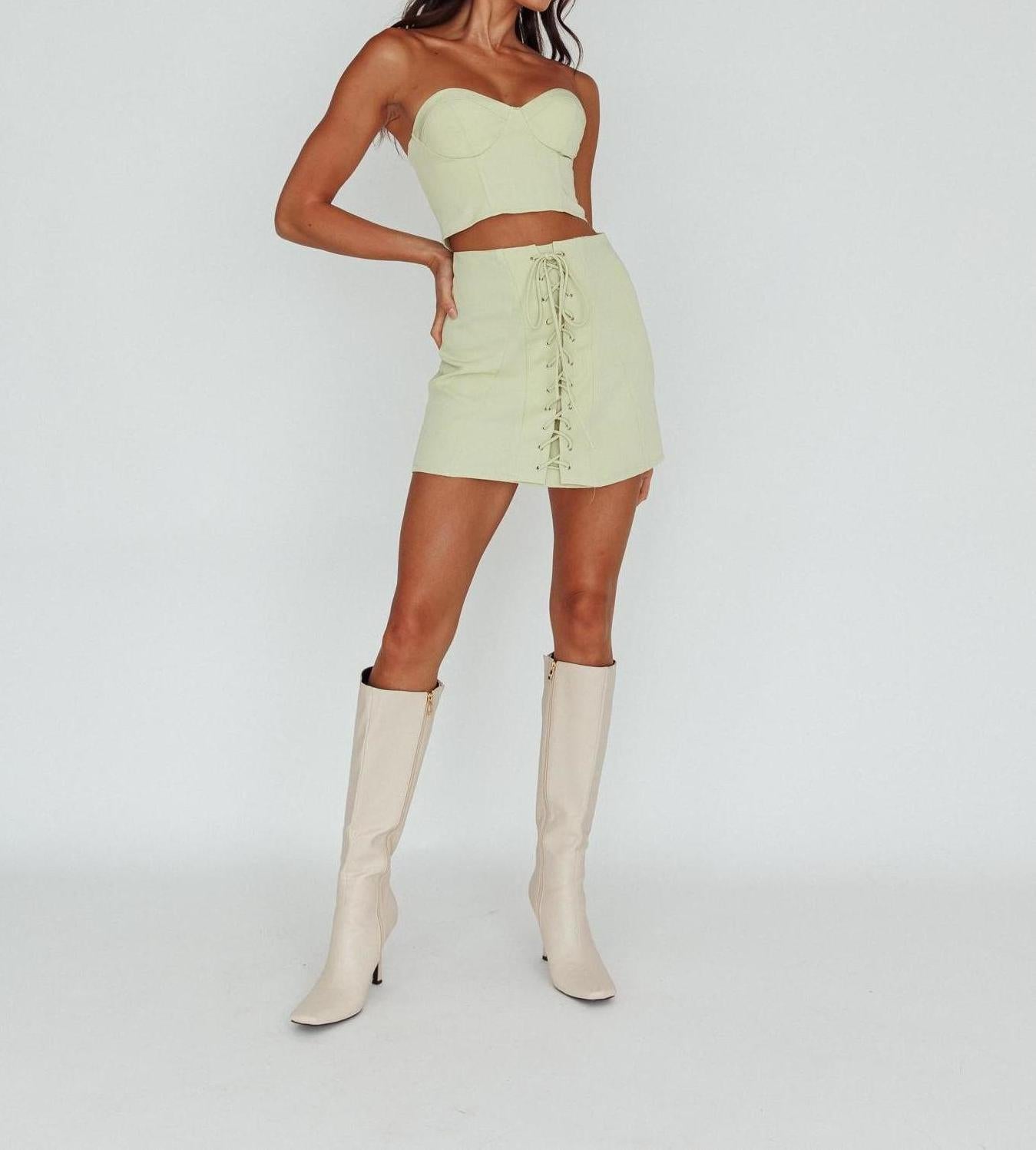 Introducing our captivating Tini Mint set, designed to turn heads wherever you go. The top features a flattering sweetheart neckline with a corset-style bodice, complete with padding for enhanced shape and support. Embrace effortless allure with the back zipper closure, ensuring a seamless fit every time.