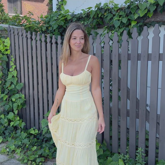 Radiate sunshine in our Sorrento Lemon Lace Maxi Dress, a dreamy and feminine piece made for warm days and golden sunsets. Designed with a flattering structured bodice that beautifully defines the waist, it falls into a soft, flowy skirt detailed with delicate lace trims for a romantic touch.
